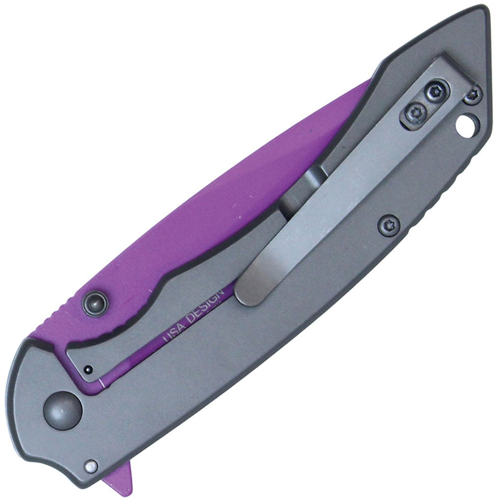 Assisted Open Folding Pocket Knife with Grey handle and Purple Blade